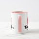 A custom coffee mug personalised with your name underneath the text: Future Mrs. Designed with an illustration of a smiling bride holding a bouquet of flowers in her fancy white wedding dress and wearing a veil. Set inside a pink oval frame with a scalloped border.
