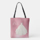 Chic “Bride” tote bag with a beautiful watercolored wedding gown on a faux pink metallic background. Gorgeous.