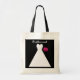 This fun bridesmaid bag features a modern white bridal gown with a bouquet of pink roses on a black background. The word "Bridesmaid" appears above the bridal gown. A great way to say thank you to your fabulous bridesmaids. Copyright Kathy Henis