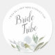 Elegant watercolor botanical bridesmaid or maid of honour proposal candle label in a unique round format frames your proposal details with a border of grey watercolor leaves and florals in pale, cool shades of greys and greens. The font is set in an elegant traditional sans serif and script type. Perfect for adding to candles for asking bridal party gifts. To see more designs like this visit VG Invites at www.zazzle.com/vginvites