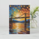 A vibrant sunset casts a warm glow over a serene river, crossed by a silhouetted bridge with trees lining both shores. The sky is dotted with colourful, mosaic-like patches, creating a lively and dynamic backdrop.