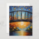 A vibrant sunset casts a warm glow over a serene river, crossed by a silhouetted bridge with trees lining both shores. The sky is dotted with colourful, mosaic-like patches, creating a lively and dynamic backdrop.