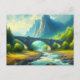 A majestic stone bridge spans a flowing river, set against the backdrop of towering mountains bathed in sunlight. Lush green forests on either side of the river add to the serene and tranquil atmosphere.