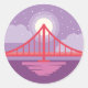 A bridge glowing in shades of red pink against a dreamy purple night sky, a luminous full moon shines behind drifting clouds while its reflection shimmers across the calm water below.