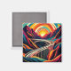 A.I .created print of a bridge spans across a ravine within a stylized, surreal mountain landscape as the sun sets in the distance beyond the peaks.
