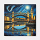 A.I .created print of a vibrant surreal night scene depicts a brightly lit bridge with colourful buildings reflected on a river, beneath a moonlit, starry sky.