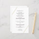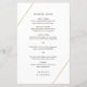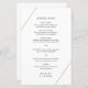 Modern geometric wedding menu with two gold lines, one across the top left and one across the bottom right over a white background. A minimalist design that still comes across as chic and stylish. These cheap wedding menus are printed on sheets of paper for a budget friendly option.