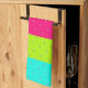 A tea towel with a mix of bright blue, mauve, pink, green and teal stripe pattern, with polka-dots, all colours can be personalised to any colour to coordinate with your kitchen decor, and text can be added to customise for yourself or a gift. White stripes are removable if you prefer.