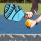 This pickleball paddle has an abstrack print with black stripes against a bright blue background. It's ready to be personalised with a name on the front so that you can create your own one of a kind gift for your favourite pickleball player.