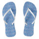 Patterned flip flops with fine lines, diamonds, and other shapes in a dark blue, bright sky blue, and white.