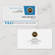 Design features the contrast of blue and white. At the top right corner sits the faux gold logo of a taxi cab in a blue trapezium. Towards its left, is the business name and slogan option. Directly underneath the blue tab are your prestigious name and job title. Near the base, there is a blue demarcation where all the details are housed below it. On the left is the business type "TAXI". You can change this according to the type of transport business you offer e.g. airport taxi, limo service etc. Beside this are the contact numbers.