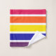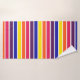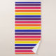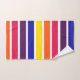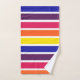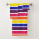 A colourful set of bath towels featuring a striped pattern design with bright, bold coloured horizontal lines in six colours: magenta, orange, yellow, blue, purple, and white.