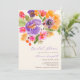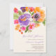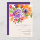Elegant bright and bold hand painted fall purple and orange boho floral bridal shower invitation featuring pretty bohemian and rustic flowers in yellow orange sunflowers, purple peonies, pink roses , green and brown with an elegant romantic brush script font typography on ivory beige. Perfect for casual boho garden party bridal celebration.