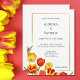 Elegant bright and colourful watercolor wedding invitation. The design features hand-drawn watercolor tulips in shades of red and yellow with green botanical elements. The colours of the flowers are vibrant and saturated. A stylish and elegant golden frame with text in elegant calligraphy completes the design. Personalise the details by adding your name, location, date, etc. Please browse my Red and Yellow Spring Tulip Wedding Collection for more matching wedding items.