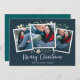 Elegant and festive holiday photo card frames three of your favourite square photos with a subtle deckled edge border and green and white holiday foliage peeking out at the corners. "Merry Christmas" appears along the bottom in white calligraphy script, with your names and the year beneath.