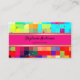 A colourful abstract business card featuring a chequered pattern with festive confetti and eye catching text backgrounds.