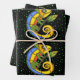 This set of wrapping paper sheets are black with vibrant green dots and rows of bright colourful fantasy lizards in yellow, green, blue, and orange holding a twig with a leaf.