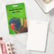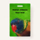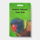 This name or identification badge has the head and face of a bright colourful macaw Parrot whose feathers are blue, green, yellow and orange on a green backgroun. Back is same green background. Customise your name and information with the templates.