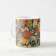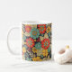 This modern floral coffee mug features trendy shades like bright red, orange, teal, and pale yellow on a dark navy blue background.