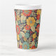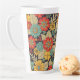 This modern floral latte mug features trendy shades like bright red, orange, teal, and pale yellow on a dark navy blue background.