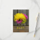 A wedding RSVP featuring a photo on front of jar of bright pink and green daisies topped with a yellow dahlia. Background is barnwood. Personalise the text on front and back.