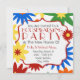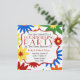 A housewarming party invitation featuring a background of retro inspired flowers in various bright shades of orange, red, green, yellow, and blue on front and back. Personalise the text inside white bracket frame outlined in red.