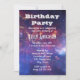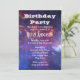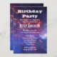 Birthday party invitation. A colourful and luminous photograph of a galaxy. A combination of bright colours and ethereal plasma formations make this beautiful outer space photo a pleasure to behold. A mixture of vivid purples blues orange and red all swirling and mixing together with some glowing accents scattered around creates a wonderful abstract image.
