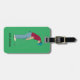Bright green background with a golfer, wearing a cap, red shirt and blue pants, putting a golf ball luggage tag. Customise the text.