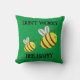 Don't worry. Bee happy. This pun is written in a distressed style capitals on a bright green square throw pillow, and decorated with two cartoon style, very cute, baby bees. The bees are mainly bright yellow and the text is black. The design is on both sides of the pillow / cushion.