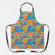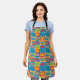 This apron has a mid-century modern design of bright colours that make rounded rectangles with other rectangles inside formed by a collection of lines.