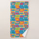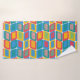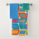 This towel set has a seafoam washcloth, a blue hand towel, and a bath towel with a mid-century modern design of bright colours that make rounded rectangles with other rectangles inside formed by a collection of lines.