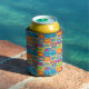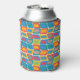 This can cooler has a mid-century modern design of bright colours that make rounded rectangles with other rectangles inside formed by a collection of lines.
