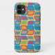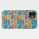 This phone case has a mid-century modern design of bright colours that make rounded rectangles with other rectangles inside formed by a collection of lines.
