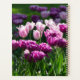Bright lilac and pink tulips on a sunny day in the garden. The photo was taken in June 2022. The poster is suitable for interior design.
