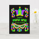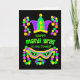 A vibrantly coloured Mardi Gras Greeting Card for a Cousin, with a crown, a mask and a string of beads in bright green, purple and yellow on a black background. You can change the inside message if you wish.
