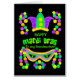A vibrantly coloured Mardi Gras Greeting Card for Grandmother, with a crown, a mask and a string of beads in bright green, purple and yellow on a black background. You can change the inside message if you wish.