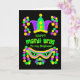 A vibrantly coloured Mardi Gras Greeting Card for a Nephew, with a crown, a mask and a string of beads in bright green, purple and yellow on a black background. You can change the inside message if you wish.