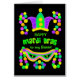 A vibrantly coloured Mardi Gras Greeting Card for a Sister, with a crown, a mask and a string of beads in bright green, purple and yellow on a black background. You can change the inside message if you wish.