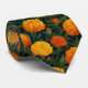A vivid pattern of marigold flowers in rich orange and yellow hues with detailed petals and lush green leaves set against a dark background for a bold botanical neck tie design.