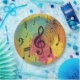 Unique and eye-catching, this cool and retro music design features musical notes in a circular pattern with a large treble clef in the centre on a bright paint splat and psychedelic tunnel background.
