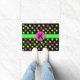 Add colour to your front door entrance with this fun door mat done in black, with fuzzy neon pink, green, and yellow polka dots. A bright green band, across the middle of the mat, has a pink circle with a large black grunge one letter monogram ready to personalise.