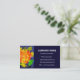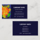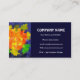 An eye-catching business card with an abstract orange, yellow and green design on a dark blue background, with white lettering. Ready for you to customise with your own details.