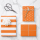 This set of wrapping paper sheets features a solid bright orange coloured sheet with coordinating sheets of wide bright orange stripes on white, and white polka dots on bright orange.