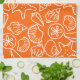 Pretty, bright orange kitchen towel with seashell art. Coastal, artistic design has white beach shell outlines in an all-over pattern.