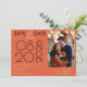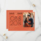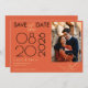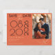 A modern save the date card in trendy bright orange colour. This shade of orange is called Verona Sunset. Details in faux gold silhuette of a delicate flower. Modern big typography making date of wedding stand out.