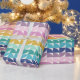 This cute wrapping paper features a pattern of simple geometric shapes in a pastel rainbow colour palette.