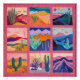 This vibrant abstract art print features a bold pink-framed grid of colourful desert landscapes. Each panel offers a unique geometric representation of desert flora, mountains, and wildlife, combining a range of bright colours like orange, purple, and turquoise. The structured grid and lively palette create an eye-catching, modern design perfect for adding energy and creativity to any space. Ideal for fans of abstract art and desert landscapes, this artwork is a statement piece for contemporary home décor.