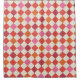 A colourful, fun argyle print shower curtain in white, bright orange, red, and pink.