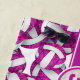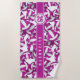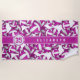 This unique volleyballs pattern beach towel features a random pattern of varied size bright pink / purple and white stylised volleyballs turned every which way on a customisable white background - personalise with her name and jersey number - by katz_d_zynes