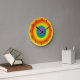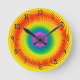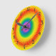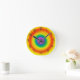 This is a brightly coloured wall clock with numbers which would be perfect for a childs room. The design is of rainbow coloured sunburst swirls in bright yellow, red, orange, green, blue and purple. Designed by Lark Designs